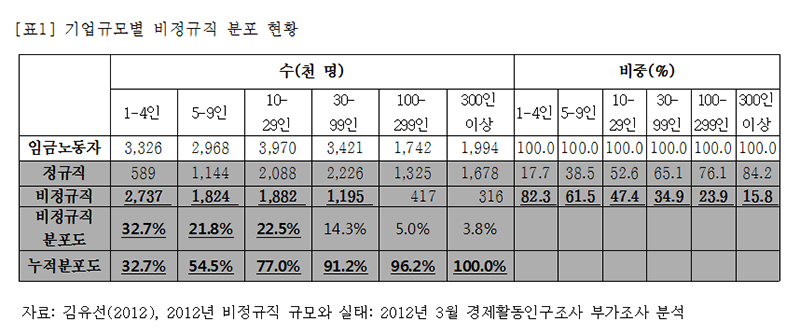 둘째, 비정규직의 77%가 ‘30인 미만 사업장’에 존재한다는 것을 주목할 필요가 있다. 비정규직은 △5인 미만 사업장에 32.7% △5~9인 사업장에 21.9% △10~29인 사업장에 22.5%가 존재한다. 이러한 현상이 의미하는 것은 무엇인가? 간단하다. ‘지불능력’이 없는 소규모 기업이 비정규직을 고용하고 있다는 점이다. ([표1] 참조.) 그렇게 볼 때, ‘비정규직의 정규직화’ 구호는 일부의 경우에는 타당하지만, 대부분의 경우에는 매우 공허한 주장이다. 사실상 어느 정도는 ‘실현 불가능한’ 요구를 그간 했던 셈이다. 그리고 진보정당의 일부 정치인들이 한때 주장했던 ‘비정규직의 정규직 전환 지원금 제도’ 역시도 실천적으로 매우 무기력한 대안일 수밖에 없다. 의도와 무관하게 생색내기용 대안을 벗어날 수 없었던 셈이다.