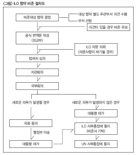 ILO 핵심 협약을 비준하는 방법에는 두 가지가 있다. 하나는 입법을 통해 비준하려는 협약에 맞도록 국내법령을 정비한 후 비준하는 방법(‘선 입법 후 비준 방식’)이고, 다른 하나는 정부가 국제협약을 먼저 비준하고, 그에 충돌하는 국내법령의 제·개정을 추진하는 방법(‘선 비준 후 입법 방식’)이다.