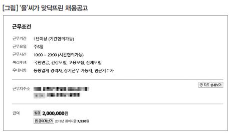 ‘을’씨는 직장을 구하기 위해 구직사이트에 접속한다. 사이트는 지역별, 기간별, 테마별로 검색할 수 있게 구성되어 누구든 쉽게 일자리를 찾을 수 있다. 서울을 선택해, 세부 지역과 업종, 근무기간, 근무요일을 고른다. 조금 덜 쉬더라도 돈을 벌고 싶기에 ‘1년 이상’, ‘주 6일’을 택한다. 프리미엄(광고비를 많이 낸) 채용정보를 지나 한 음식점의 채용정보를 클릭한다. 10시~23시 근무, 복리후생으로 ‘국민연금, 건강보험, 고용보험, 산재보험’이 적혀있는데 한 달 월급은 2백만 원이란다. 이상하다. 4대 보험을 복리후생이라 적은 것은 그렇다 치더라도 최저임금 위반2)이다.