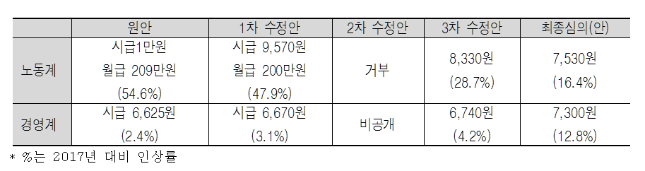 2018년 적용 최저임금심의를 위해 제1차 최저임금위원회 전원회의(이하 전원회의)가 4월7일 개최되었으나 노동계 위원의 불참으로 파행되다가 6월15일 제3차 전원회의에 복귀하면서 정상화 되었다. 이후 6월29일 제6차 전원회의에서 노‧사 모두 최초 요구안을 제출하였으며 7월12일 제10차 전원회의에서 1차 수정안을 제출, 7월15일 추가 수정안 제출 및 최종심의안을 노동계(시급 7,530원)와 경영계(시급 7,300원)가 각각 제출하여 투표(15:12)를 통해 시급 7,530원을 의결하였다.