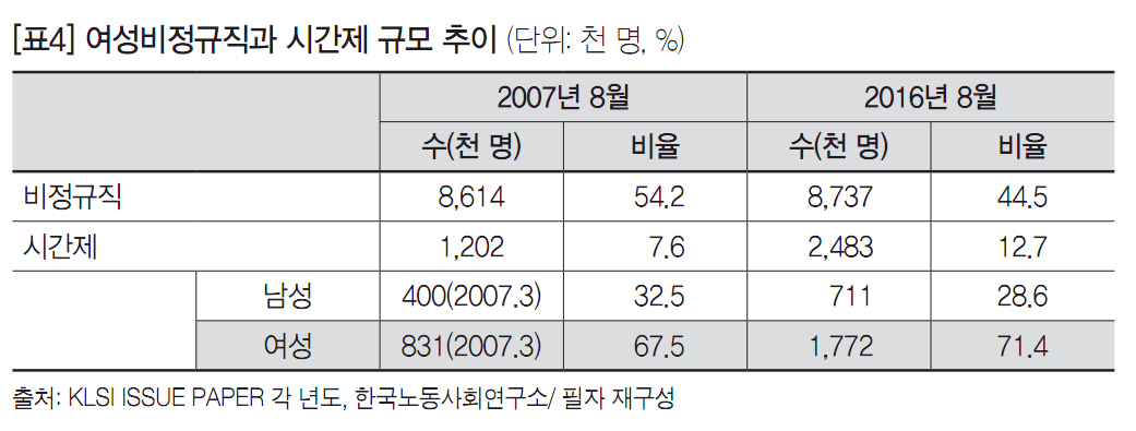 지난 10년간 정규직과 비정규직의 임금 격차는 오히려 확대됐다. 연도별 임금 격차를 비교한 결과 2007년 8월 기준 비정규직의 월평균 임금은 정규직 대비 50.5%, 2016년 8월에는 49.2%로 집계됐다. 그뿐만 아니라 임금 불평등도 심화됐다. 경제활동인구조사 부가조사에서 전 산업 월 임금총액 평균값을 계산하여 알아본 결과 상위 10%와 하위 10% 임금격차(P9010)는 2007년 5.16배에서 2016년 5.63배로 증가했다. 가장 심각한 것은 성별 고용형태별 임금격차다. 2016년 3월 여성의 시간당 임금은 남성 임금의 65.5%이며, 남녀 고용형태별로 분류할 경우 여성비정규직은 남성 정규직 임금에 비해 43.2%에 불과하여 비정규직 여성에 대한 차별이 가장 심각한 것으로 드러났다. 이러한 이유 중의 하나는 여성의 일자리가 대부분 ‘시간제 일자리’로 확충되었기 때문이다. 실제 지난 10년 동안 시간제 일자리는 두 배 이상 증가했는데, 남성의 비율은 32.5%에서 28.6%로 감소한 반면 여성은 67.5%에서 71.4%로 증가했다.