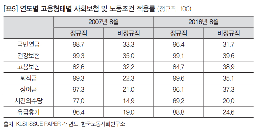 전 세계적으로 자본의 유연화전략에 의해 정규직 고용형태가 파괴되면서 저임금 비정규노동의 확산 및 소득 불평등은 심화되고 있다. 1945년 이후 40여 년 동안 대부분의 산업국가에서 다수의 노동자들은 괜찮은 임금, 노동에 관한 불공정한 대우에 대한 보호, 국가나 사용자가 제공하는 사회보험, 일정 정도의 일자리 안전성(security)을 포함한 노동권을 누려왔다. 이러한 권리들은 정규직‧직접고용으로 표현되는 표준고용계약에 의해 주어졌다. 그러나 이러한 표준고용관계(standard employment relationships)는 임시‧일시적 고용, 파트타임, 파견 및 3자 고용관계, 특수고용형태 등 ‘비표준’(non-standard) 고용관계로 변화하고 있다. 이러한 세계적인 추세는 한국이라고 예외는 아니다. 1997년 외환위기 이후 신자유주의 노동시장 유연화가 전면화되면서 한국의 노동시장은 빠르게 바뀌었다. 정규직 일자리가 비정규직으로 대체되고, 신규 일자리의 대부분은 비정규직으로 채워졌다. 비정규직은 고용의 불안정성뿐만 아니라 정규직의 절반에 불과한 임금과 열악한 노동조건, 그리고 사회안전망에서 제외되는 극심한 차별로 인해 한국 사회의 최대 이슈로 부상했다. 이에 따라 2000년대 중반 이후에는 입법적 방식으로 비정규직 문제 해결을 모색하기 시작했으며, 그 결과 비정규직 규모 축소 및 차별 해소를 목적으로 한 비정규직법이 많은 진통 끝에 2007년 7월1일부터 시행되었다.