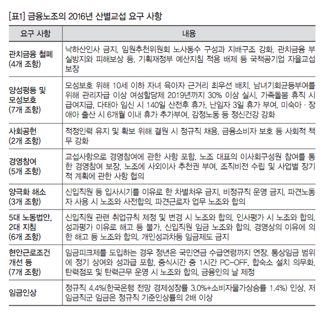 아울러 금융노조는 금융노동자의 근로조건에 대한 정부 개입이 직권남용 및 부당노동행위임을 명백히 밝히고, 교섭을 거부하는 사용자에 대해서도 적극 대처했다. 낙하산인사 등 관치금융 철폐, 양성평등과 모성보호, 사회공헌, 노조의 경영참여, 사업장 내 양극화 해소를 위한 저임금직군 근로조건 개선 등 공세적 안건을 전면 배치함으로써 사측의 성과문화 확산 담론을 무력화시키기 위해 투쟁했다. 금융노조가 사용자에게 요구한 2016년도 산별교섭 요구내용은 아래 표와 같다([표1]).