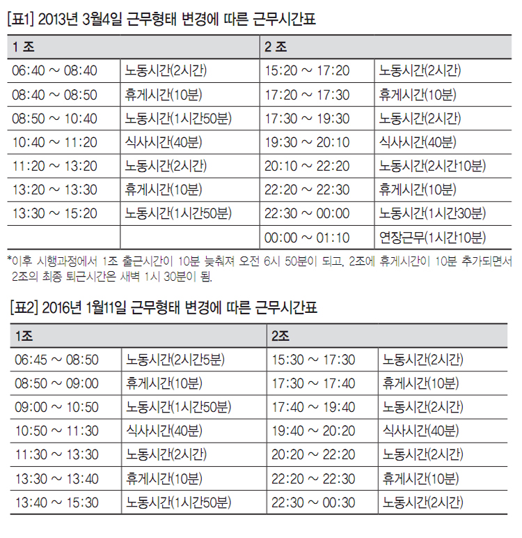 2013년 3월4일. 현대자동차의 근무형태가 ‘8/8+1시간’의 주간연속 2교대제로 변경되었다. 이어 2016년 1월11일 ‘8.08/8.33시간’으로 다시 한 번 근무시간이 단축되었다. 시간으로 따지면 55분의 노동시간이 단축된 것이다.