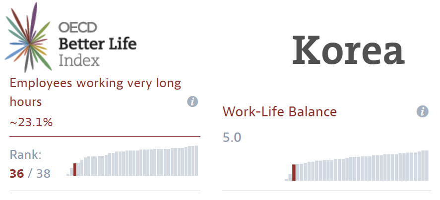 (OECD가 발표한 '2016년 더 나은 삶 지수'에서 한국은 장시간 노동 순위와 일과 삶의 균형 부문에서 조사대상 38개국 중 36위를 차지했다.  ⓒOECD)
