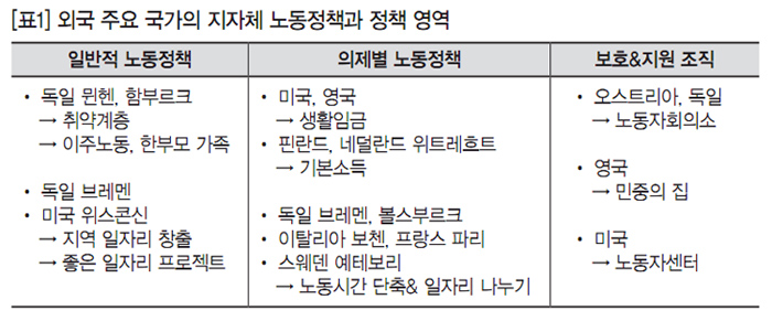 그러나 21세기에 들어 외국의 주요 지자체들은 도시의 취약근로계층을 범주화하고, 이들에 대한 맞춤형 지원 사업을 시행하는 등 주로 일자리 고용정책에 초점을 두고 있다. 이는 우리나라에 미국 위스콘신이나 아일랜드 등의 노사정 일자리 모델들이 잘 알려져 있는 것처럼, 국가와 노동에 초점을 둔 노동체제(labor regime)보다는 노동시장의 상호작용에 초점을 둔 고용체제(employment regime)를 중시하는 현실을 보여주는 것 같다. 특히 고용과 실업 문제가 이들 국가의 거시정책의 핵심 의제로 자리 잡으면서 지방정부에서도 지역 내 고용과 일자리 사업들이 지자체 사업의 주된 영역을 차지하고 있다.
