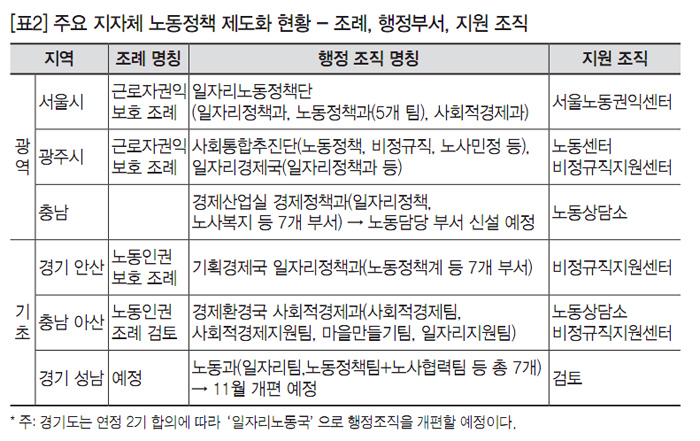 우리나라 지방정부의 노동정책은 이제 막 시작됐다고 봐야 한다. 대부분의 지자체에 기업지원과는 있으나 노동 전담 행정조직은 없으며, 노동정책을 뒷받침할 조례를 제정한 곳은 3곳(서울시, 광주시, 안산시)에 불과하다. 또한 서울시를 제외한 여타 지자체의 노동정책 기본계획과 중간지원조직(센터) 등의 제도화 수준은 미흡하다. 광역지자체 중 광주시와 충남 정도만이 현재 노동정책을 준비 중이고, 기초 지자체 중에는 안산시(2016년 6월 노동인권 조례 제정), 성남시(2016년 8월 노동과 신설 재편), 아산시(2016년 9월 노동정책 기본계획 발표)가 이제 막 노동행정의 첫발을 내딛은 상태다.