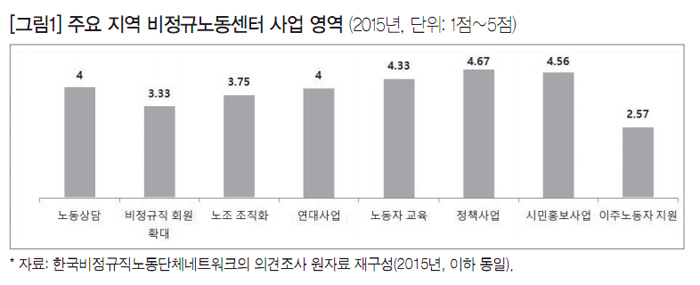 한편 지원센터들은 주로 노동과 관련한 실태조사와 교육 및 상담, 캠페인 등을 진행하고 있다. 2015년 주요 센터 담당자를 대상으로 설문조사한 결과, 센터의 주된 사업영역은 정책(4.67점), 시민홍보(4.56점), 노동자 교육(4.33점), 노동상담(4점), 연대협력사업(4점), 노조 조직화(3.75점), 비정규 회원 확대(3.33점), 이주노동자 지원(2.57점) 순이었다([그림1]).