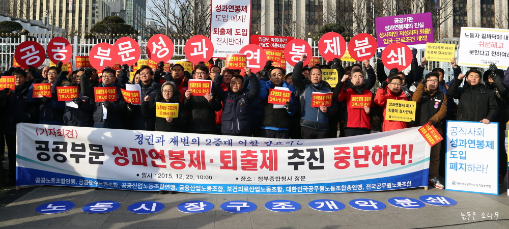 지난해 정부는 중앙정부 및 지방자치단체 산하 공공기관을 대상으로 ‘2차 공공기관 정상화’ 정책을 시행하려 했다. 하지만 노조의 강력한 반발에 부딪혀 임금피크제만 도입하고 성과연봉제와 저성과자 퇴출제는 2016년 과제로 설정한 바 있다. 그리고 정부는 끝내 지난 1월28일 성과연봉제 적용 대상을 비간부직까지 확대하는 정부 방침을 발표했다.