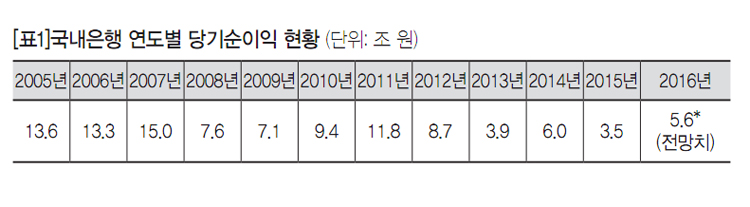전국금융산업노동조합 조합원들의 고용과 임금인상의 기초가 되는 2016년 국내은행 당기순이익은 5조 6천억 원 수준에 그칠 전망이다. 작년보다는 상황이 나아졌으나 지난 10여 년간에 비해서는 여전히 낮은 수준이다. 지난 2005년 이래 은행권의 연간 당기순이익은 아래와 같다.