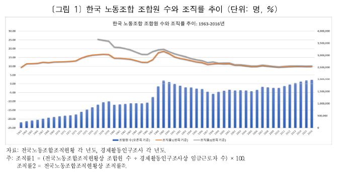 한국의 노동조합 조직률 변동과 관련해 확인된 사실은 다음과 같다. 첫째, 공공부문과 대기업의 조직률은 상대적으로 높고 다른 부문과 격차가 견고하다. 둘째, 고용형태의 불안정성은 노조 가입에 결정적인 장애물로 작용하고, 청년층은 노조 가입에서 배제돼 있거나 가입을 거부하고 있다. 셋째, 여성의 노동시장 참여 증가나 인구구조의 고령화, 산업구조의 서비스화 등은 노조 조직률에 부정적인 영향을 끼치지 않았다. 넷째, 노사관계제도의 변화는 정권의 성격과 상관없이 조직률의 구조적 변화에 중요한 계기로 작용해왔다.