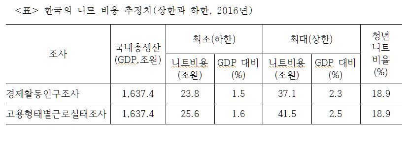 o 청년 니트가 많다는 것은 그만큼 청년 노동력이 사장되고, 사회경제적으로 막대한 기회비용을 부담하고 있음을 의미한다. OECD(2016b)는 니트의 경제적 비용을 니트가 취업하면 받게 될 총 노동소득으로 정의하고, 사용자의 사회보장 분담금을 포함하는 총 노동비용으로 측정한다. 2016년 한국의 청년 니트 비용은 최소 23조8천억 원(GDP의 1.5%), 최대 41조5천억 원(GDP의 2.5%)으로 추정된다. OECD 회원국 중 세 번째로 높은 것으로, 한국보다 니트 비용이 높은 나라는 터키, 그리스 두 나라뿐이다.